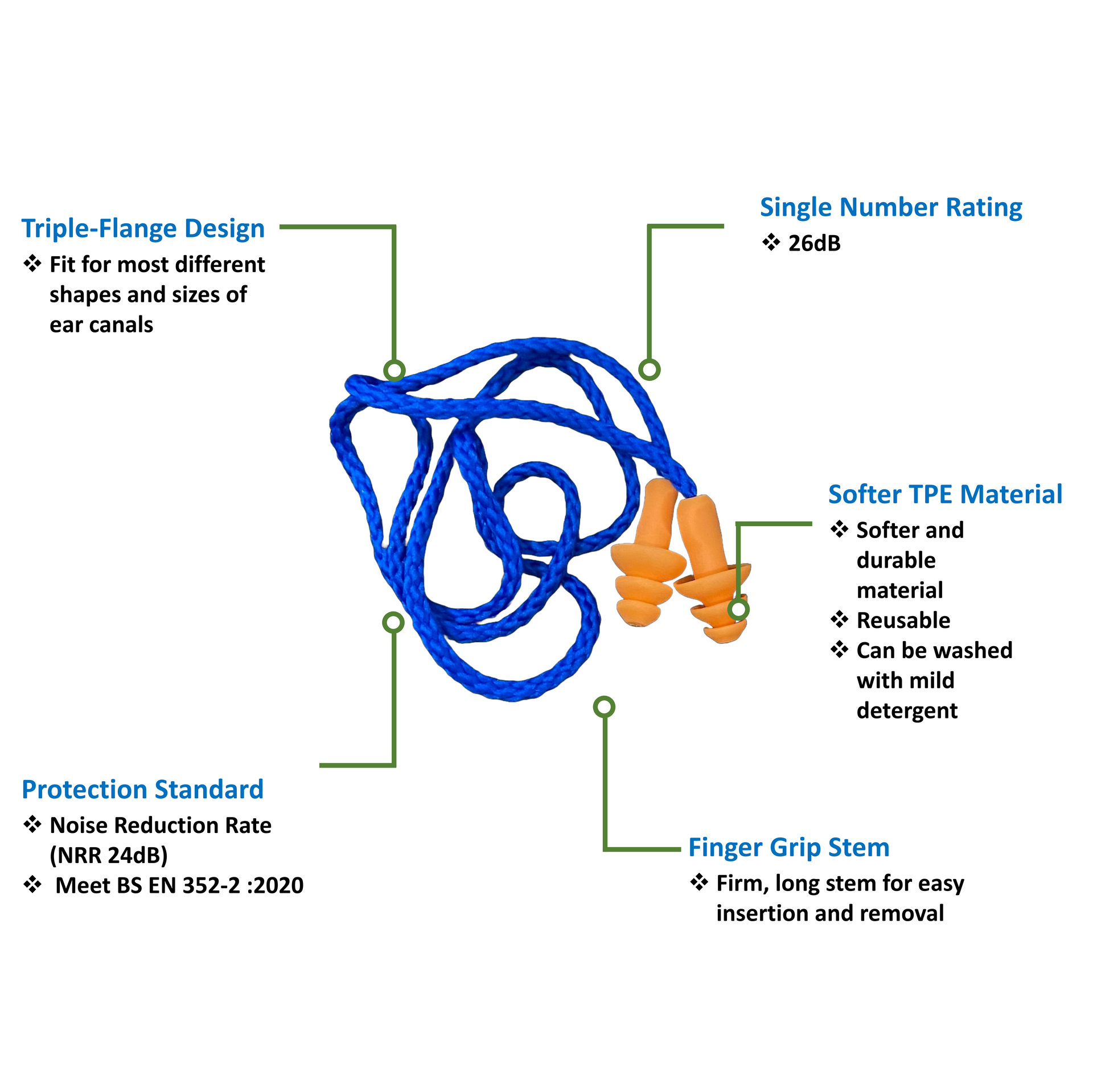 - Finger-grip stem for easy insertion and to help keep earplugs clean