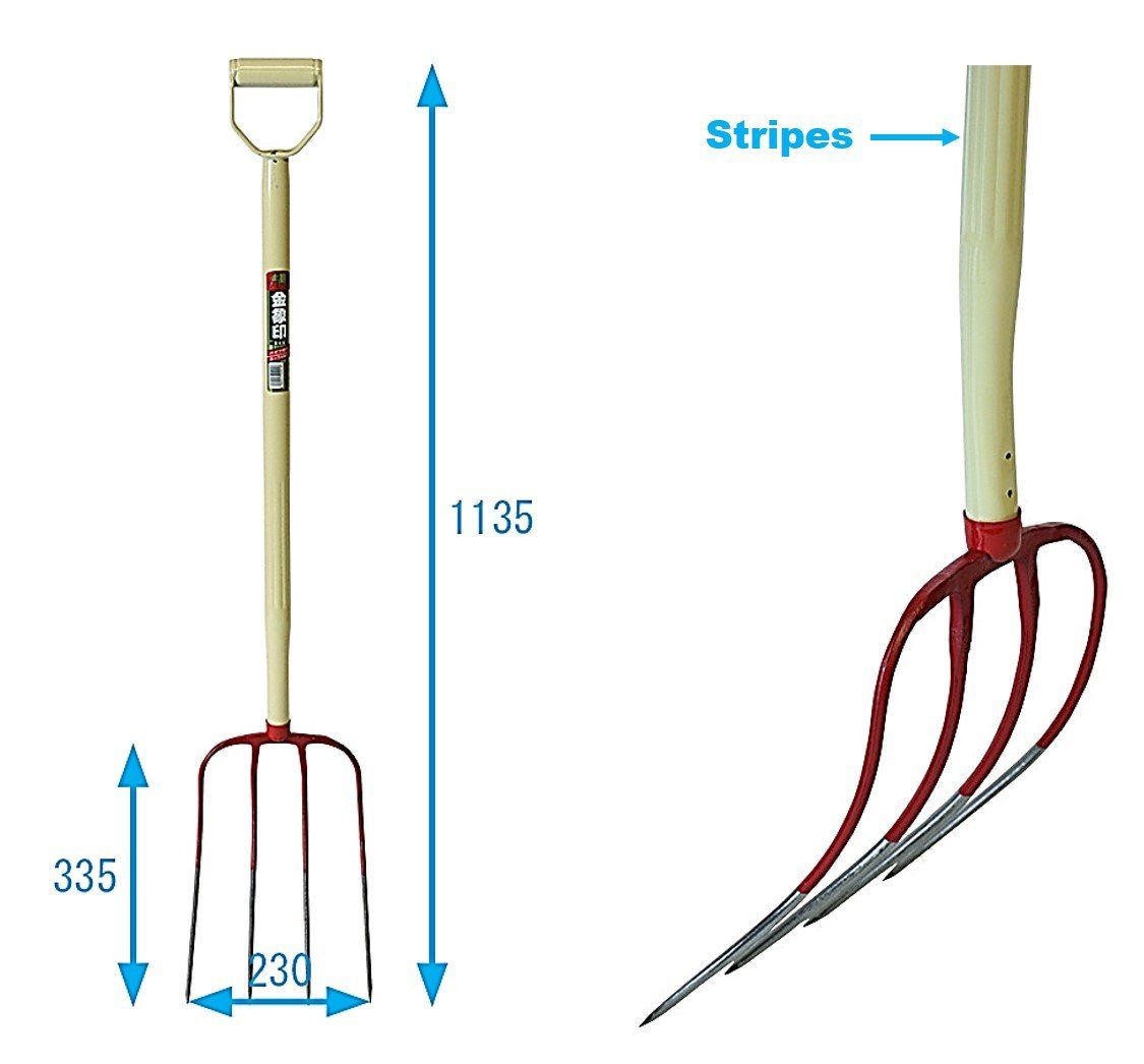 This Fri Elephant Four Finger Type Fork is very suitable for scraping, shoveling, easy to collect hay, straw, and compost. The head (Claws) is a one-piece type (Integral processing without welding), which is equivalent to using carbon steel S70C for quenching (increase strength and wear resistance) and tempering (increasing elasticity) heat treatment. The stripes on the handle of the tube achieve anti-slip function and fit hand.