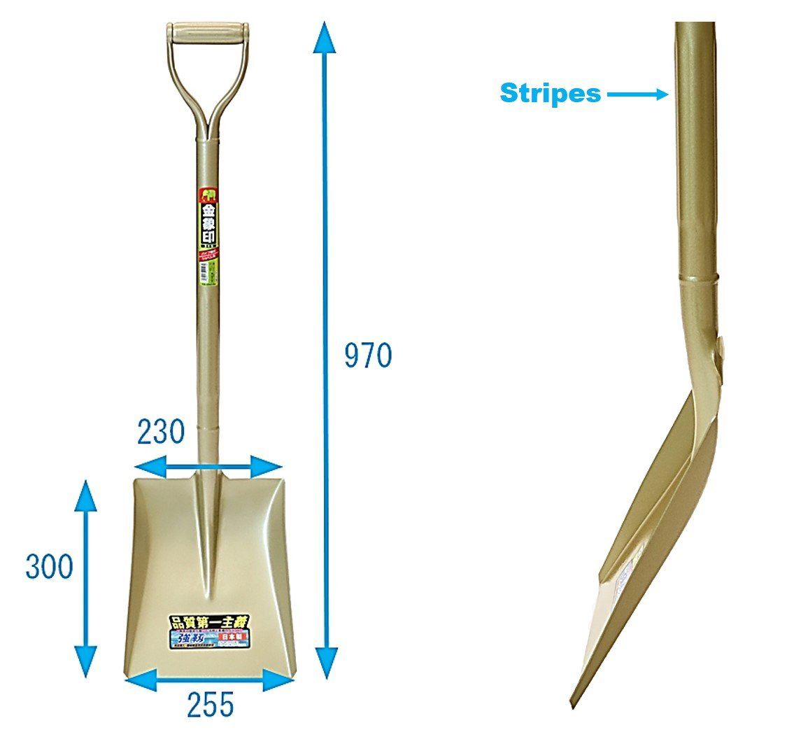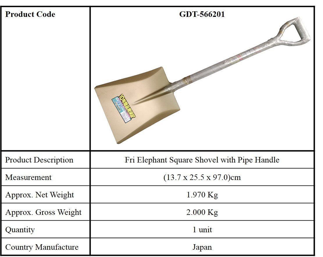 This Fri Elephant Square Shovel can be widely used for civil engineering, pavement work, landscaping, agriculture, home gardening, snow removal, etc., and is ideal for stirring and scooping work. The head (scooping part) uses a shovel steel plate equivalent to S50C and is heat-treated for quenching (increasing strength and resistance to wear) and tempering (increasing elasticity). The handle with a streak shape that gives a non-slip function and fits the hand, and the grip adopts a drum shape grip that is easy to grip.