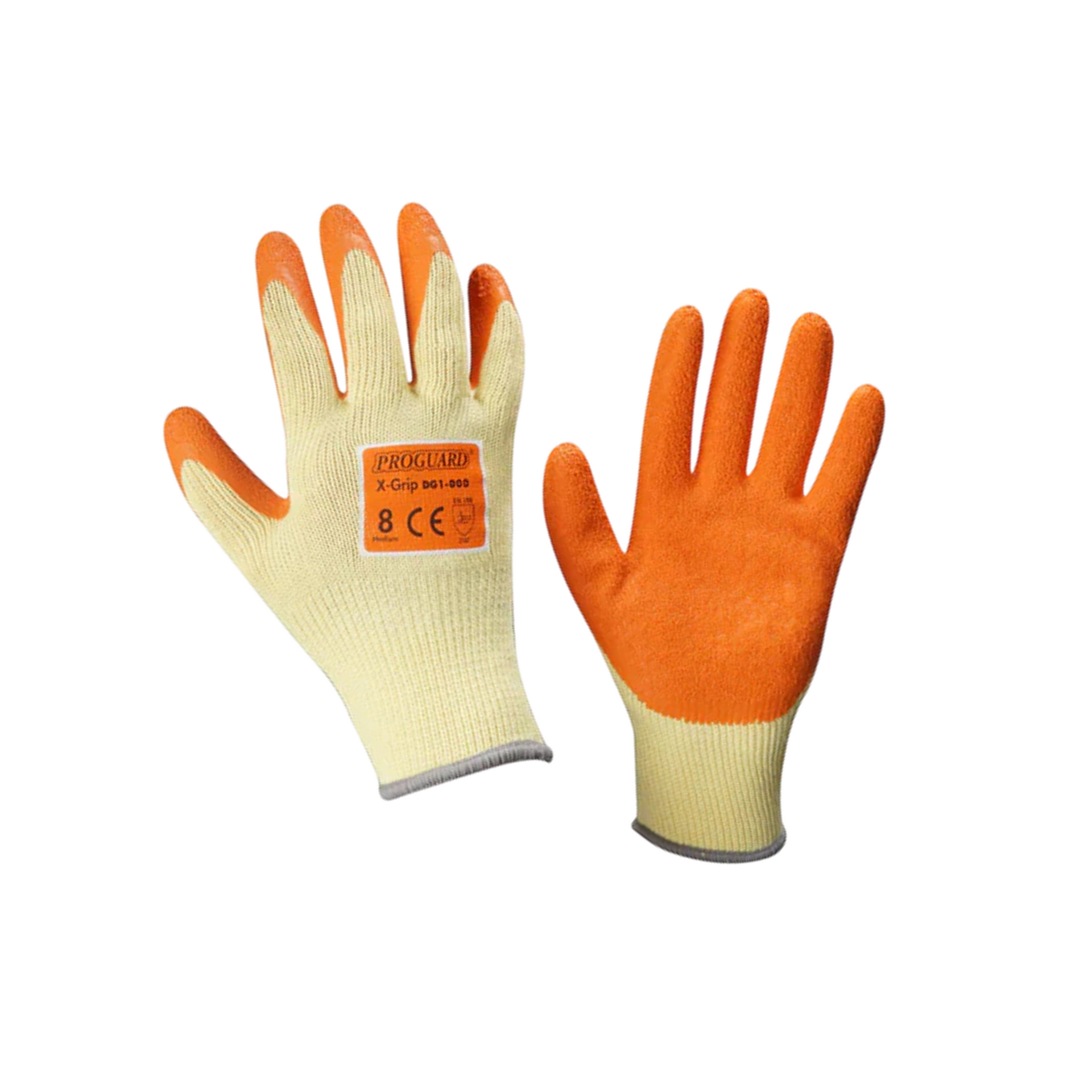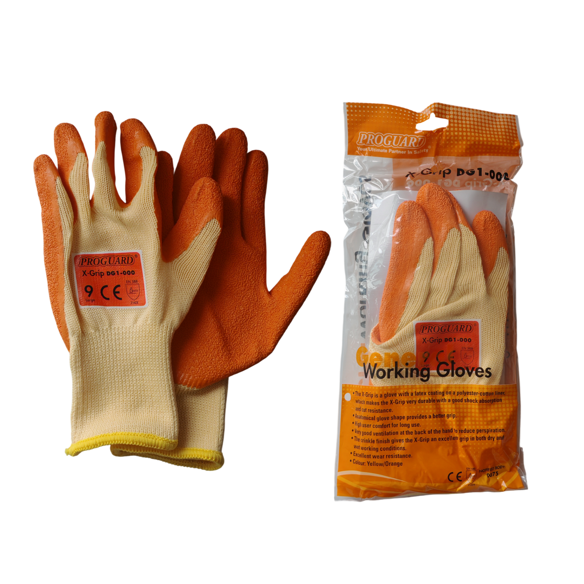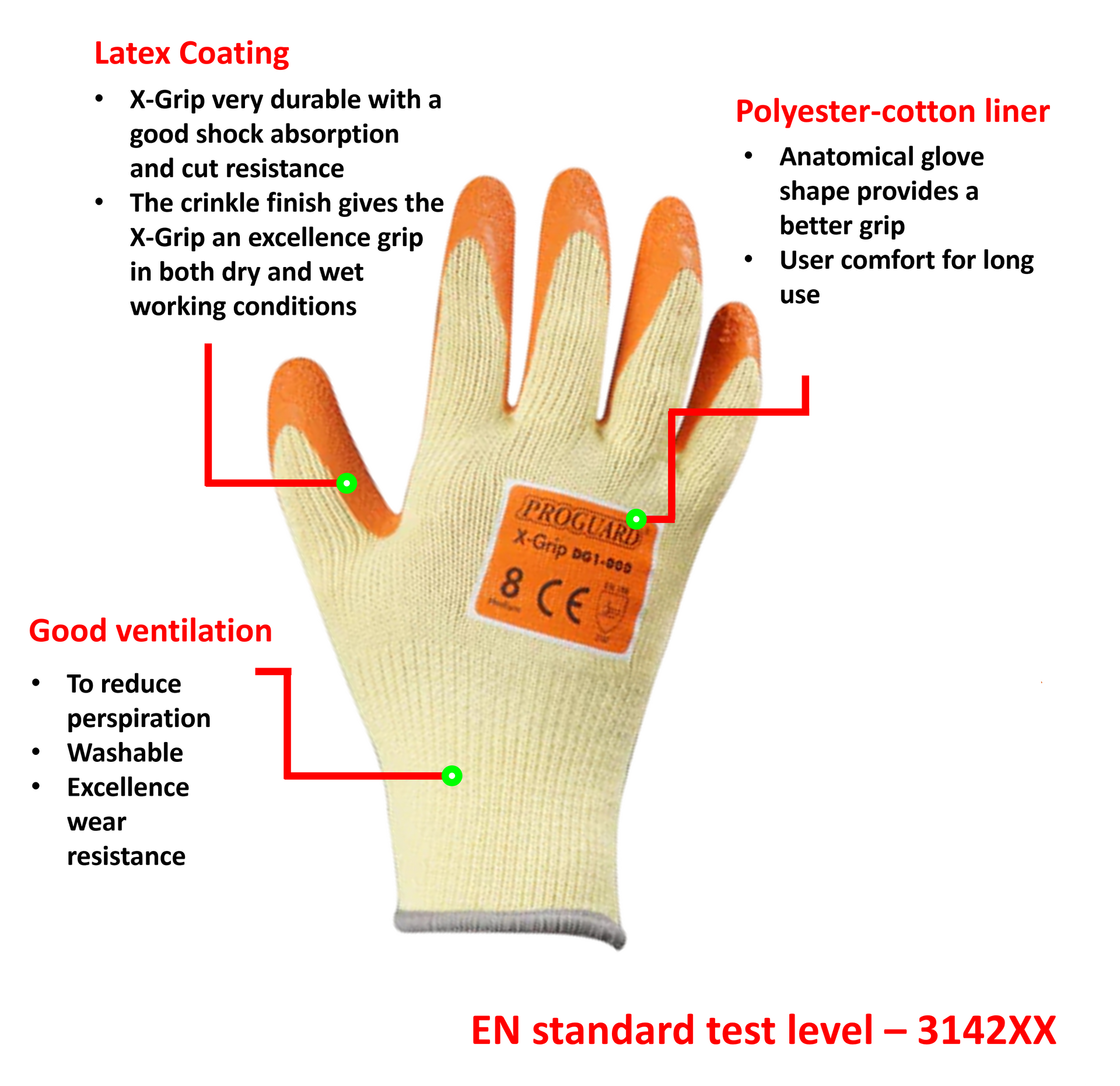 The X-Grip Glove is designed for durability, comfort, and superior grip. It features a latex coating on a polyester-cotton liner, providing excellent shock absorption and cut resistance for demanding work environments. The anatomical glove shape ensures a natural fit, enhancing grip control and reducing hand fatigue during long hours of use. With excellent ventilation at the back of the hand, the X-Grip helps minimize perspiration, keeping hands cool and comfortable. Its crinkle latex finish delivers outstanding grip performance in both dry and wet conditions.