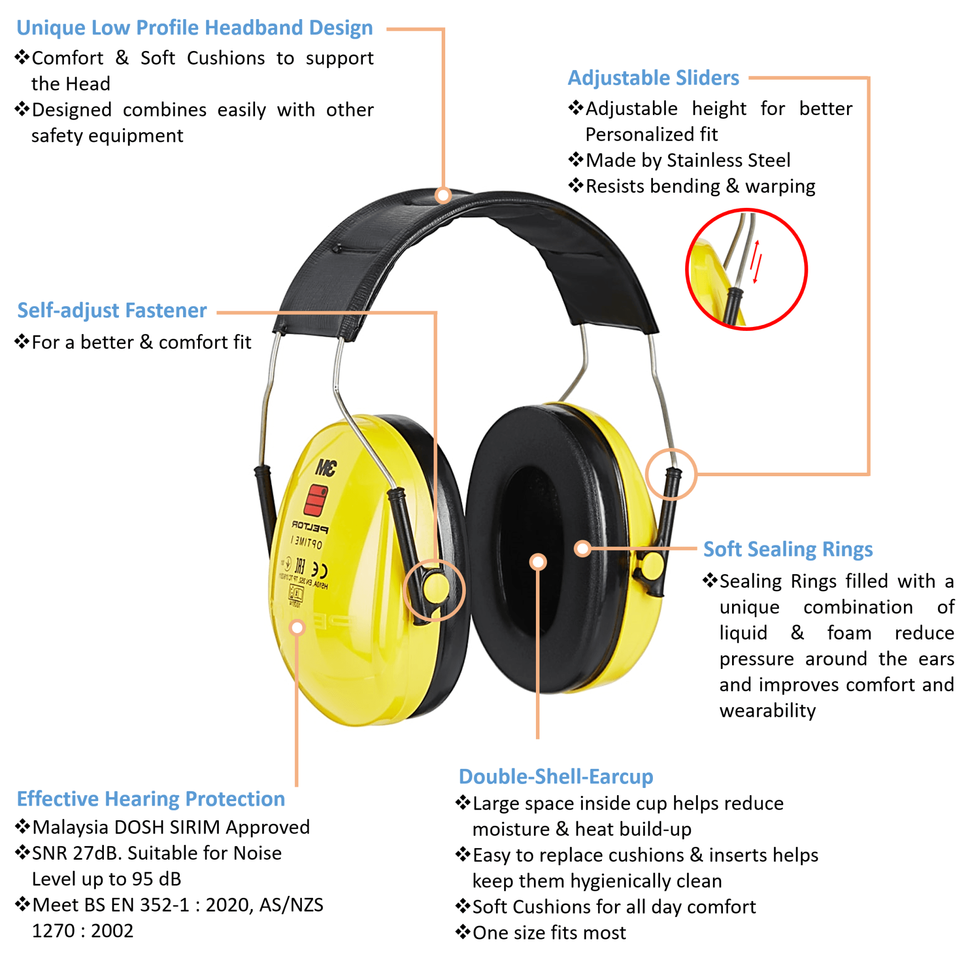 Double-Shell Earcup provides large space inside the cup, helps reduce moisture & heat build-up, easy to replace cushions & inserts help keep them hygienically clean. Soft Sealing Rings filled with a unique combination of liquid & foam reduce pressure around the ears and improve comfort and wearability. Adjustable Sliders allow adjustment of the height for better Personalized fit.