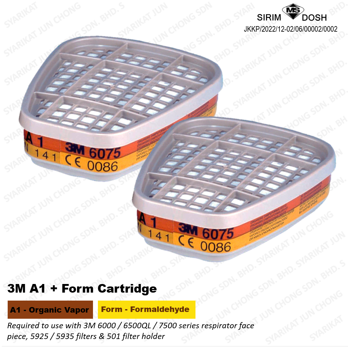 3M™ 6075 A1 + Form Gas and Vapor Cartridges protect against organic vapors with boiling points above 65°C and Formaldehyde. Suitable for use with 3M™ Reusable Respirators featuring the Bayonet filter connection system: 3M™ Reusable Half Facepiece / Full Facepiece 6000 Series, Half Facepiece 7500 Series, and Half Facepiece 6500 QL Series. They can also be used in combination with 3M™ Particulate Filters 5925/5935 and 3M™ Filter Retainer 501.