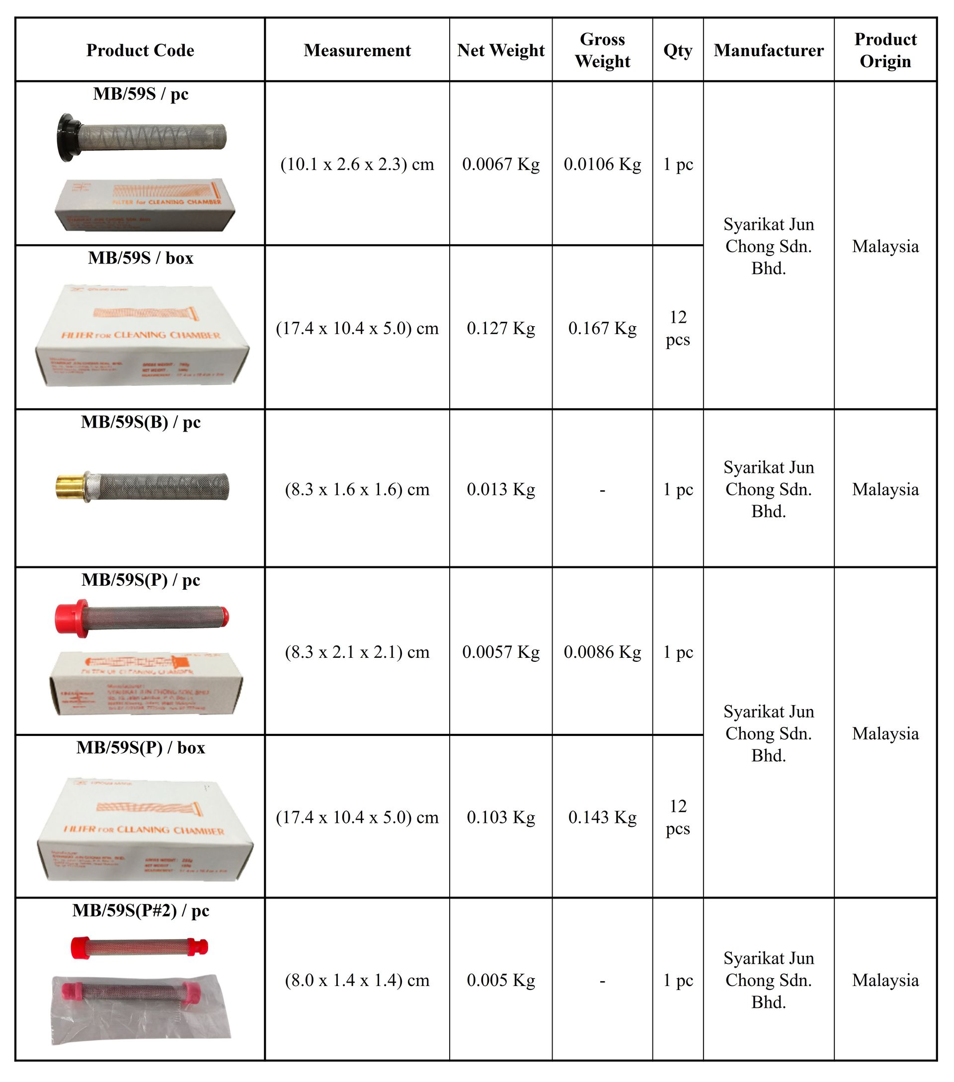 - These 3 types of Filter are suitable to use with different cleaning chambers respectively.